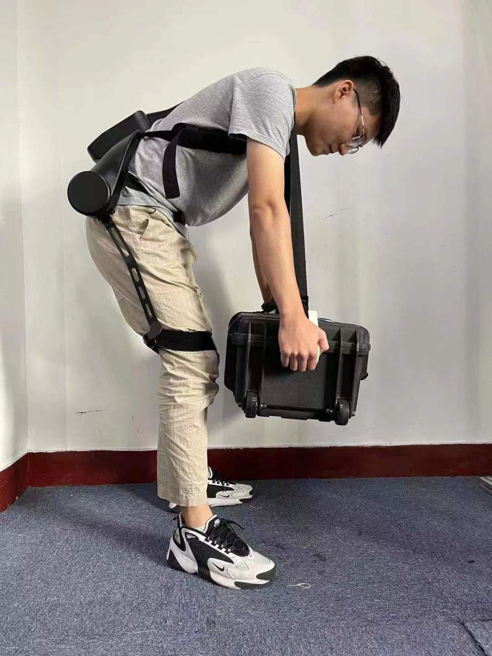 穿上这副装备后,当你刚要抬腿,这个“小助手”就能马上提供助力帮你抬腿;当你刚要弯腰起身,它也能敏锐觉察到你的动作意图,通过两根固定绑带将物体重力卸载到背部,达到一种手没使力,东西已经被提起来的效果。