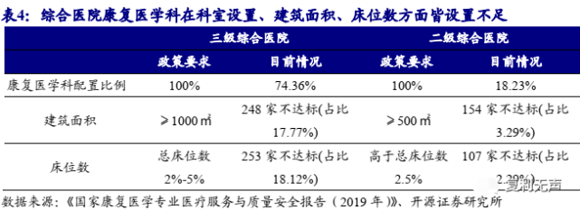 综合医院康复医学科设立不足,缺口集中于二级综合医院,已设康复医学科的三级、二级综合医院存在建筑面积、床位数量不达标的情况。