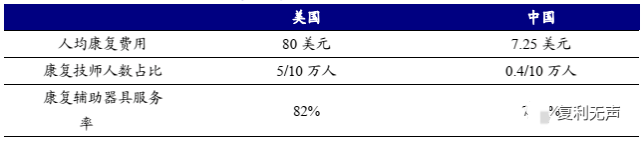 我国康复医疗产业的发展较晚,正处于成长阶段,在人均康复费用、康复技师占比、康复辅助服务率等方面,与美国存在较大差距,未来的发展空间较大。