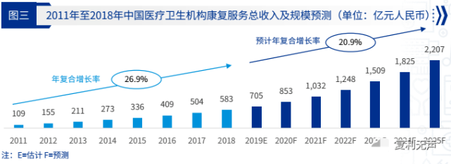 毕马威中国咨询公司分析得出,2011-2018年中国康复医疗市场总消费从109亿增至583亿元,CAGR26.9%,推算2025年市场规模将达2000亿以上。